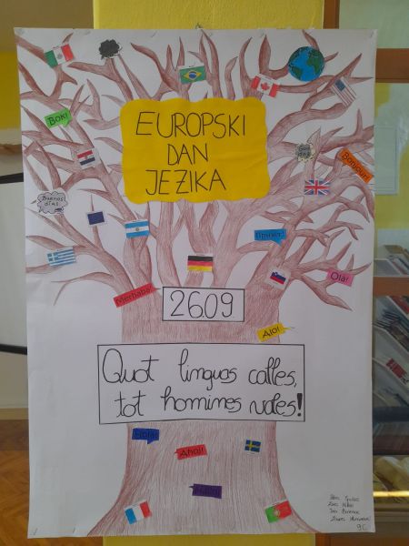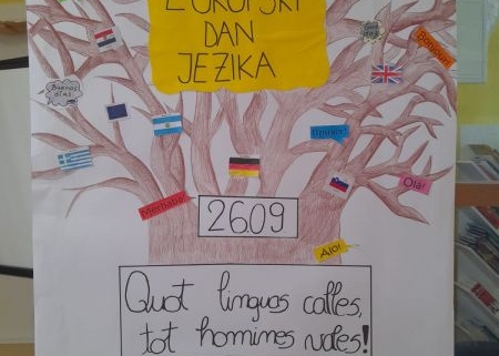 U našoj školi i ove školske godine obilježili smo Europski dan jezika različitim aktivnostima. Suradnjom školske knjižničarke i nastavnica hrvatskog , engleskog i njemačkog jezika učenici su sudjelovali u različitim aktivnostima. Knjižničarka nam je prezentirala zašto je bitno učiti strane jezike ali i njegovati svoj materinji jezik. Upoznali smo se s anglizmima, germanizma i arhaizmima u hrvatskom jeziku kroz kvizove. Radili smo straničnike u cilju poticanja čitanja.